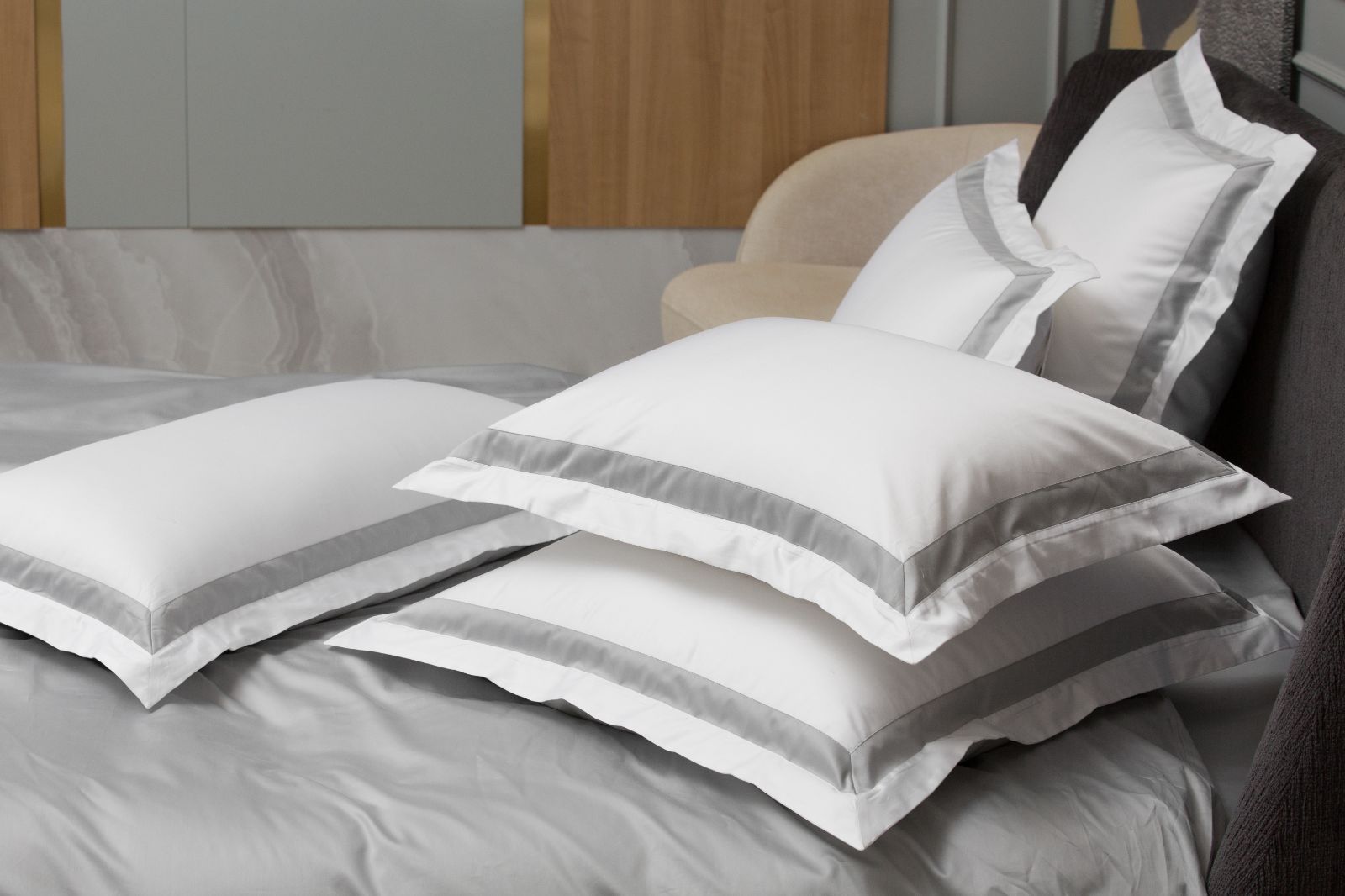 Комплекты и отдельные предметы, наделенные благородным сиянием благодаря сатиновому плетению, представлены в белом (Alpine White), шоколадном (Brownie), карамельно-бежевом (Caramel-Beige), светло-сером (Ash Grey) и темно-сером (Graphite) оттенках.