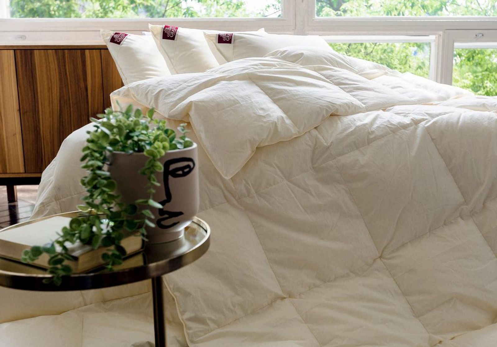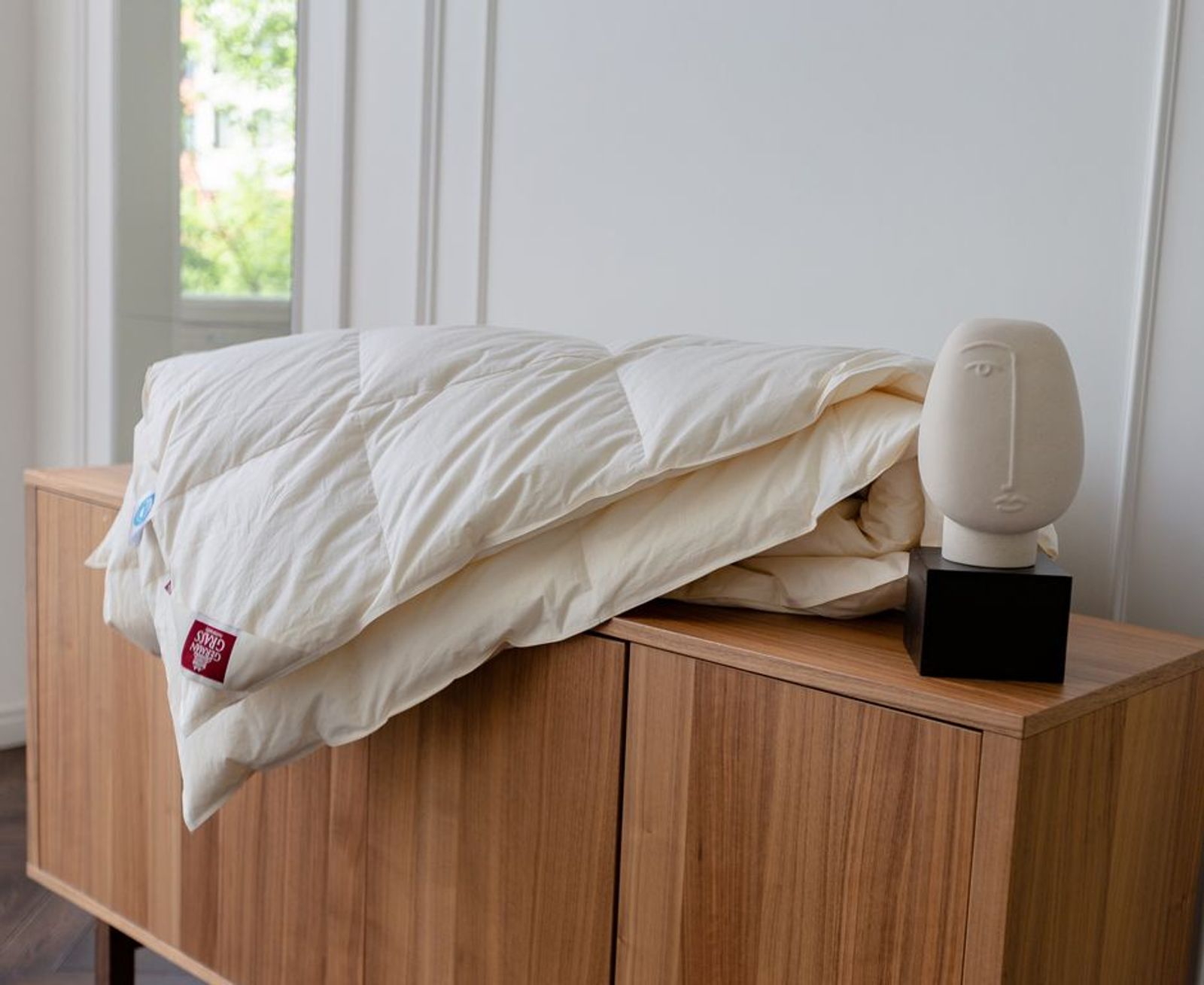 Тончайший батист имеет сертификат GOTS, свидетельствующий о том, что сырье для его создания выращено в контролируемом биологическом хозяйстве, без использования химических добавок и соответствует строгим экологическим критериям. Ткань дополнительно прошла финишную обработку SanProCare® Sensitive и отмечена маркировкой «Bramscher Tuch», что является безусловным знаком качества от специалистов из города Бра́мше в Германии. Наполнителем для коллекции служит гусиный пух категории “Экстра” повышенной упругости (Fill Power 850 ед). При малом весе он обладает особенной пушистостью и лучшей теплоизоляционной способностью. Стирка при температуре до 30°С.