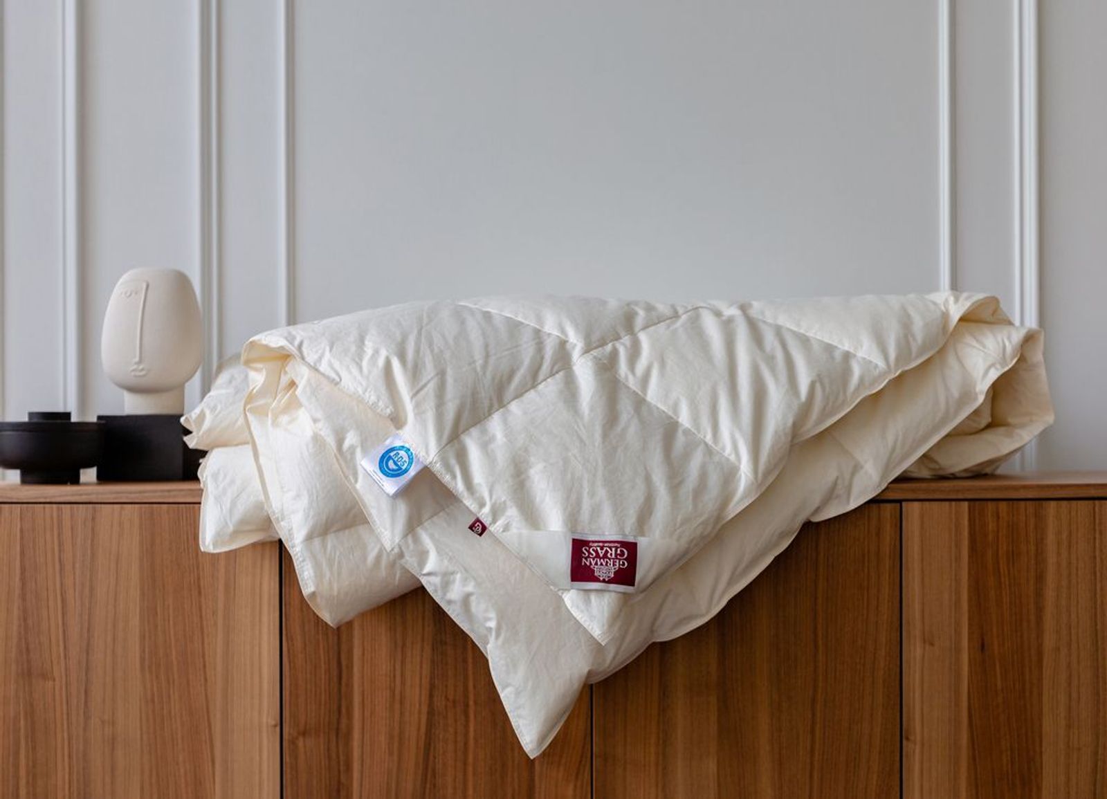 Тончайший батист имеет сертификат GOTS, свидетельствующий о том, что сырье для его создания выращено в контролируемом биологическом хозяйстве, без использования химических добавок и соответствует строгим экологическим критериям. Ткань дополнительно прошла финишную обработку SanProCare® Sensitive и отмечена маркировкой «Bramscher Tuch», что является безусловным знаком качества от специалистов из города Бра́мше в Германии. Наполнителем для коллекции служит гусиный пух категории “Экстра” повышенной упругости (Fill Power 850 ед). При малом весе он обладает особенной пушистостью и лучшей теплоизоляционной способностью. Стирка при температуре до 30°С.