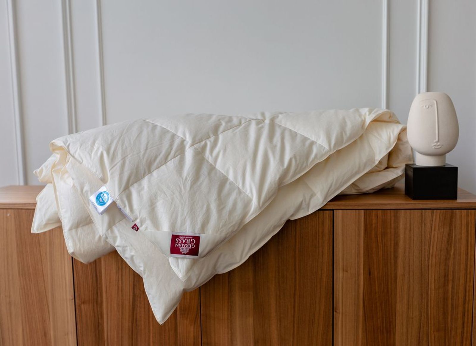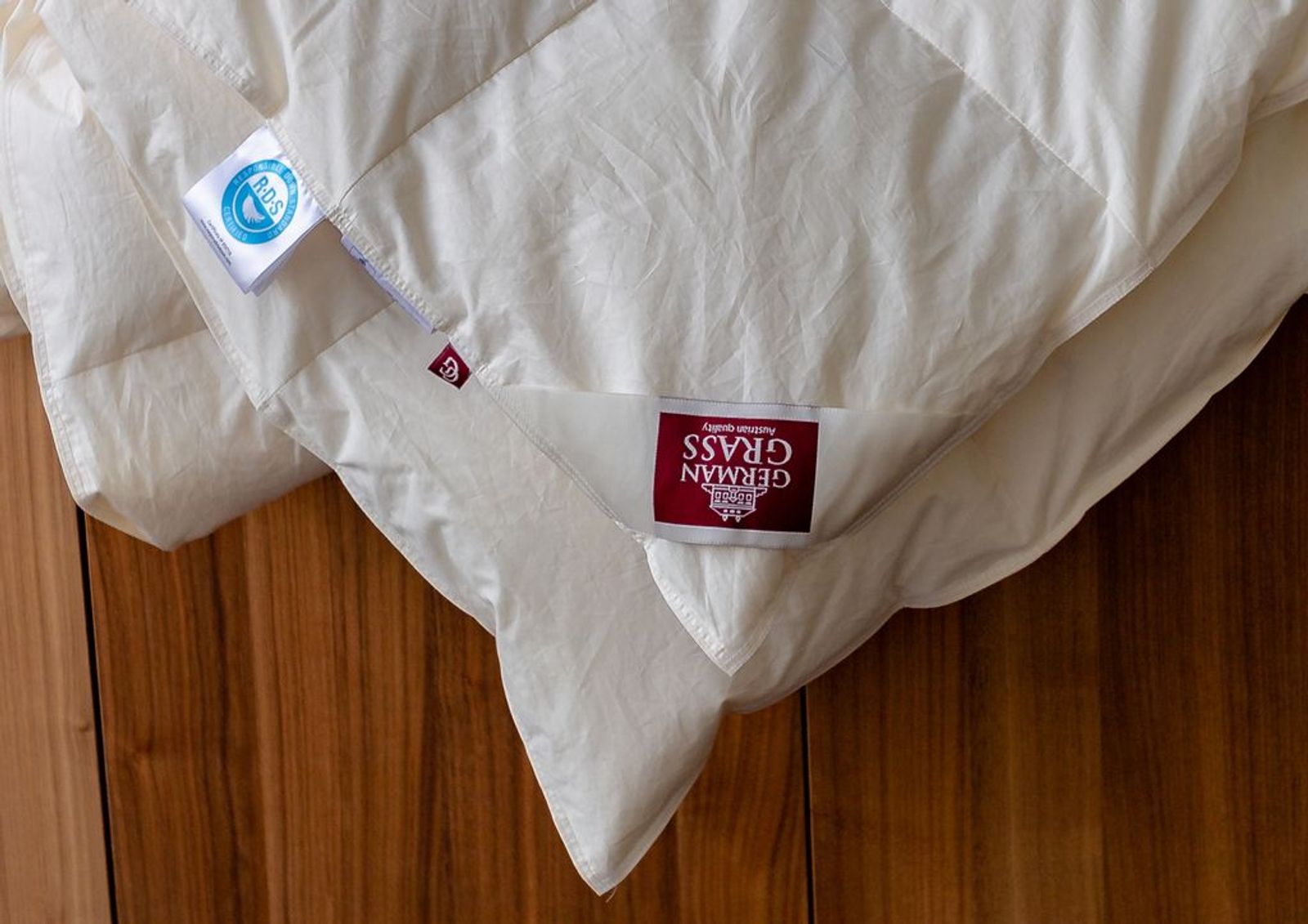 Тончайший батист имеет сертификат GOTS, свидетельствующий о том, что сырье для его создания выращено в контролируемом биологическом хозяйстве, без использования химических добавок и соответствует строгим экологическим критериям. Ткань дополнительно прошла финишную обработку SanProCare® Sensitive и отмечена маркировкой «Bramscher Tuch», что является безусловным знаком качества от специалистов из города Бра́мше в Германии. Наполнителем для коллекции служит гусиный пух категории “Экстра” повышенной упругости (Fill Power 850 ед). При малом весе он обладает особенной пушистостью и лучшей теплоизоляционной способностью. Стирка при температуре до 30°С.
