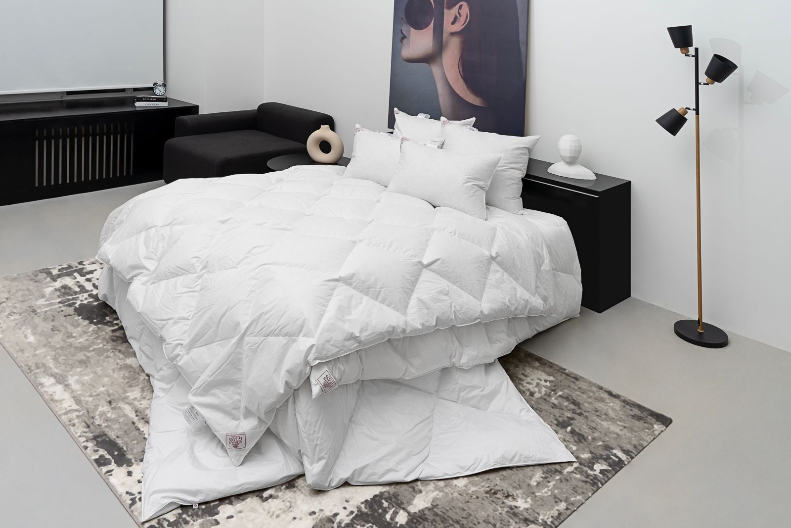 Ткань чехлов произведена известной компанией Weidmann (Зюссен, Германия), это – хлопчатобумажный пуходержащий ТИК (Mako-Cambric) с параметрами конструкции Nm 70/40, TC 251 и обладающий всеми свойствами, присущими подобного рода тканям: повышенные – гигроскопичность, плотность, долговечность и воздухопроницаемость. В коллекции используются пуховый наполнитель категории «Экстра» с небольшим добавлением мелкого пера, которое повышает упругость наполнителя и придает изделию необходимый объем.