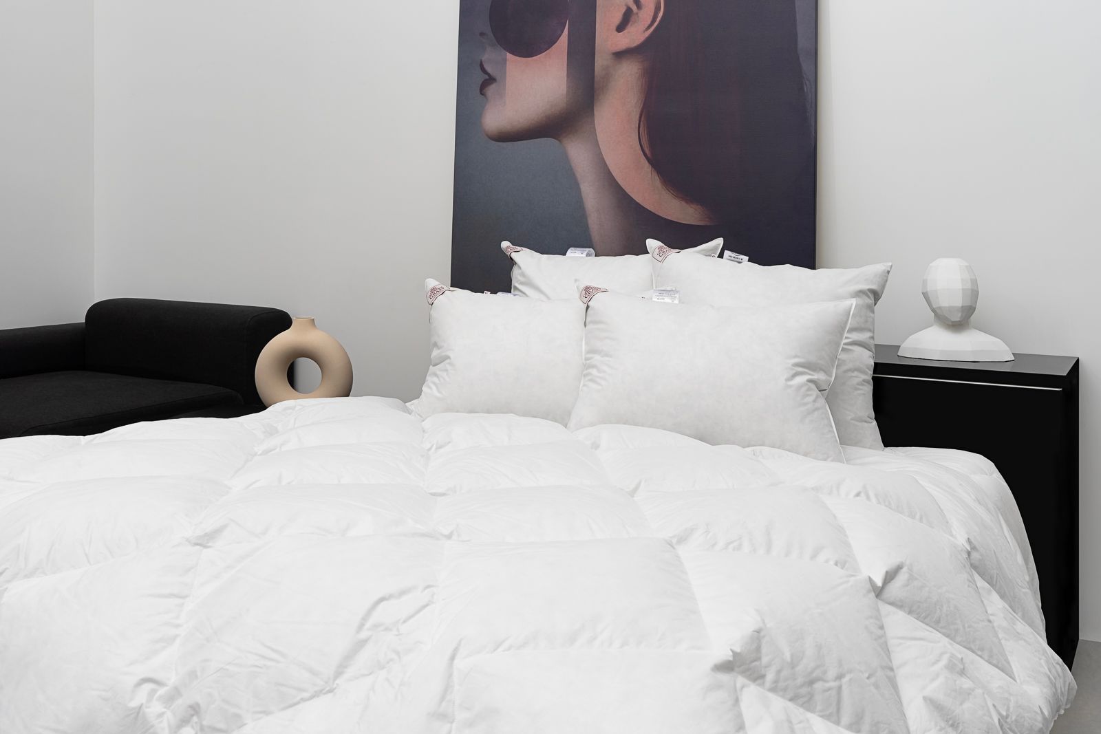 Ткань чехлов произведена известной компанией Weidmann (Зюссен, Германия), это – хлопчатобумажный пуходержащий ТИК (Mako-Cambric) с параметрами конструкции Nm 70/40, TC 251 и обладающий всеми свойствами, присущими подобного рода тканям: повышенные – гигроскопичность, плотность, долговечность и воздухопроницаемость. В коллекции используются пуховый наполнитель категории «Экстра» с небольшим добавлением мелкого пера, которое повышает упругость наполнителя и придает изделию необходимый объем.