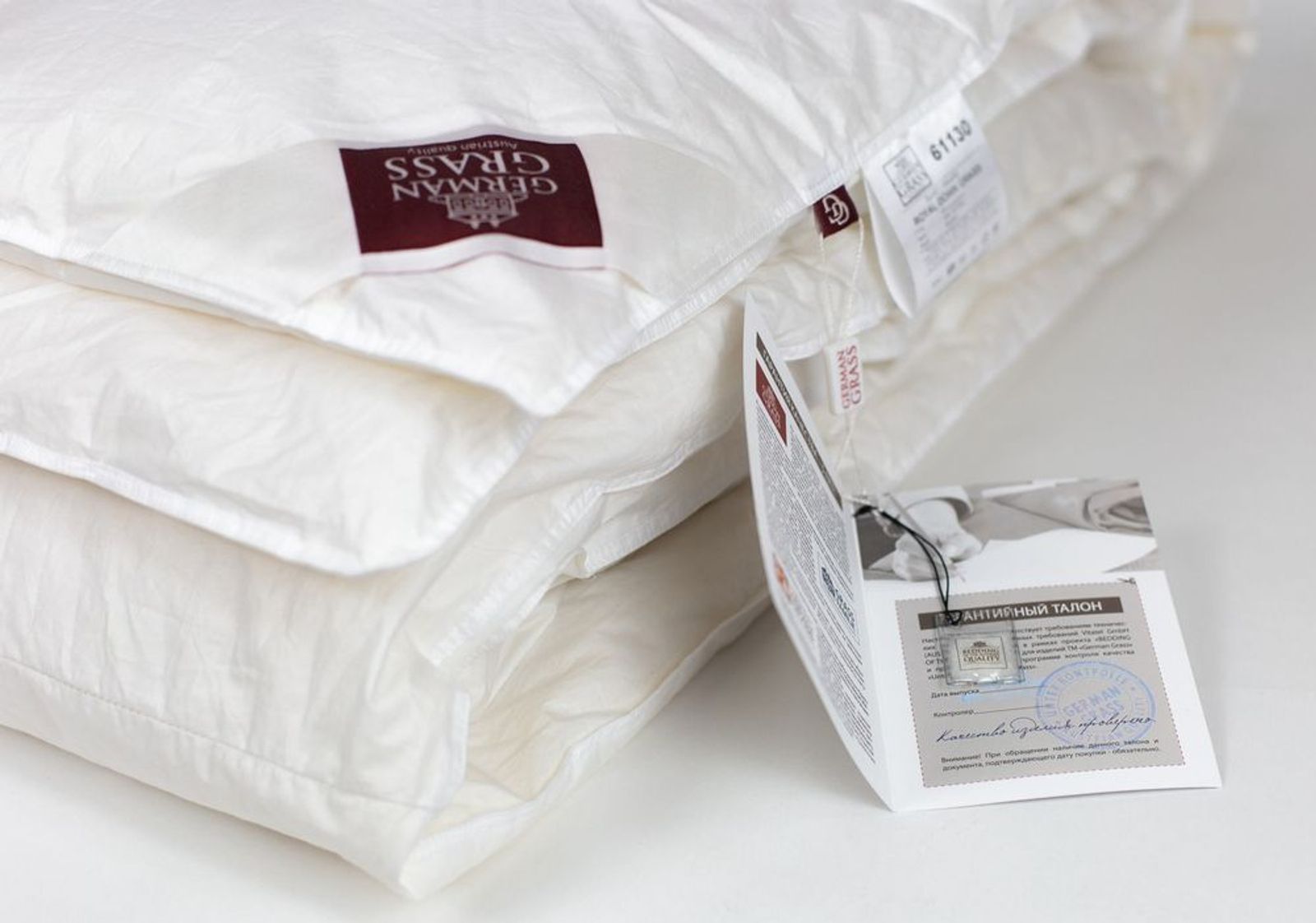 Город Бра́мше в Германии и разработанные ткачами этого поселения способы финишной обработки тканей известны производителям во всем мире уже второе столетие и поэтому маркировка «Bramscher Tuch» является своеобразным знаком качества в индустрии. Ей отмечены все изделия коллекции Royal Down Grass, указывая на исключительные качества. Супертонкий мако-батист (Mako-ultra fine batiste), из 100% египетского хлопка, прошедший финишную обработку SanProCare® Sensitive, позволяет ткани достичь состояния «пуховой мягкости». Ткани сертифицированы по OEKO-TEX® Standard 100 – стандарту безопасности текстильных изделий. Наполнителем для эксклюзивной коллекции служит гусиный пух категории “Экстра” повышенной упругости (Fill Power 850 ед). При малом весе он обладает особенной пушистостью и лучшей теплоизоляционной способностью. Для обеспечения особых гигиенических свойств, изделия прошли обработку методом озонирования Ozone Pure 360 Grass. Стирка при температуре до 30°С.
