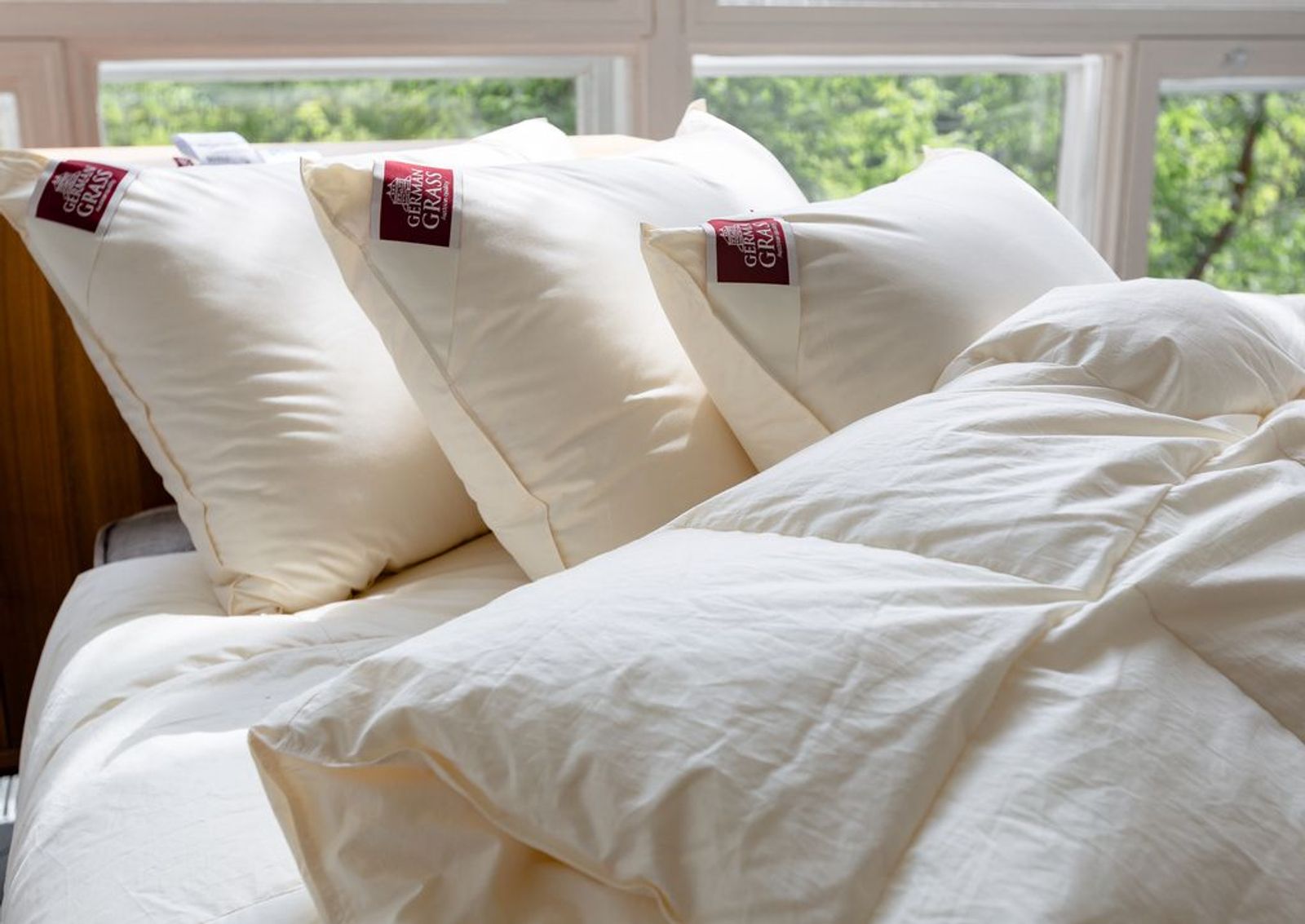 Тончайший батист имеет сертификат GOTS, свидетельствующий о том, что сырье для его создания выращено в контролируемом биологическом хозяйстве, без использования химических добавок и соответствует строгим экологическим критериям. Ткань дополнительно прошла финишную обработку SanProCare® Sensitive и отмечена маркировкой «Bramscher Tuch», что является безусловным знаком качества от специалистов из города Бра́мше в Германии. Наполнителем для коллекции служит гусиный пух категории “Экстра” повышенной упругости (Fill Power 850 ед). При малом весе он обладает особенной пушистостью и лучшей теплоизоляционной способностью. Стирка при температуре до 30°С.